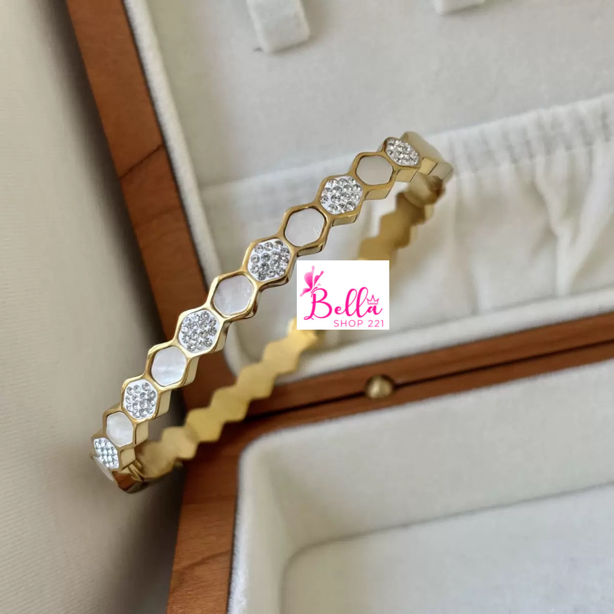 Bracelet hexagone blanc avec strass – doré (acier inoxydable)