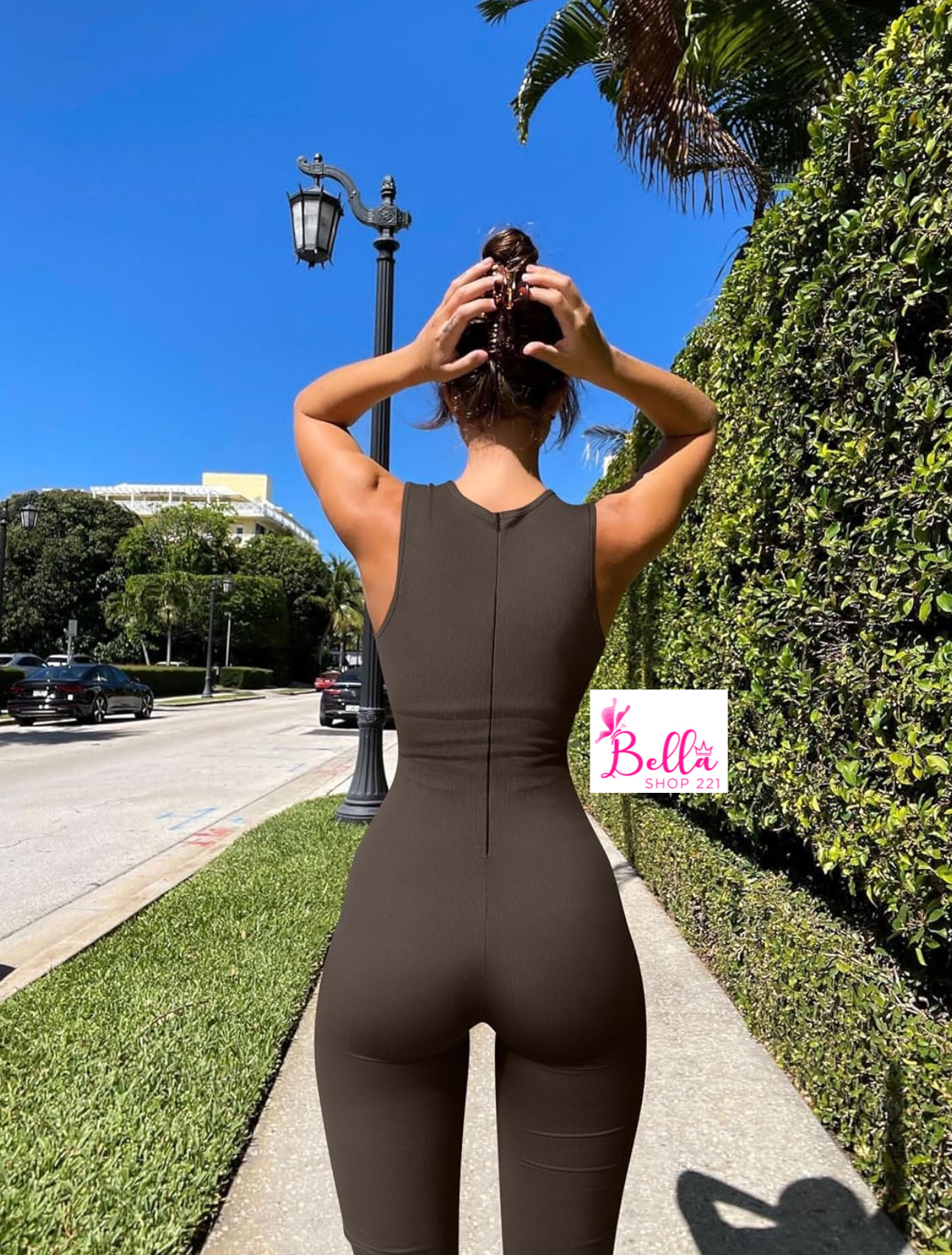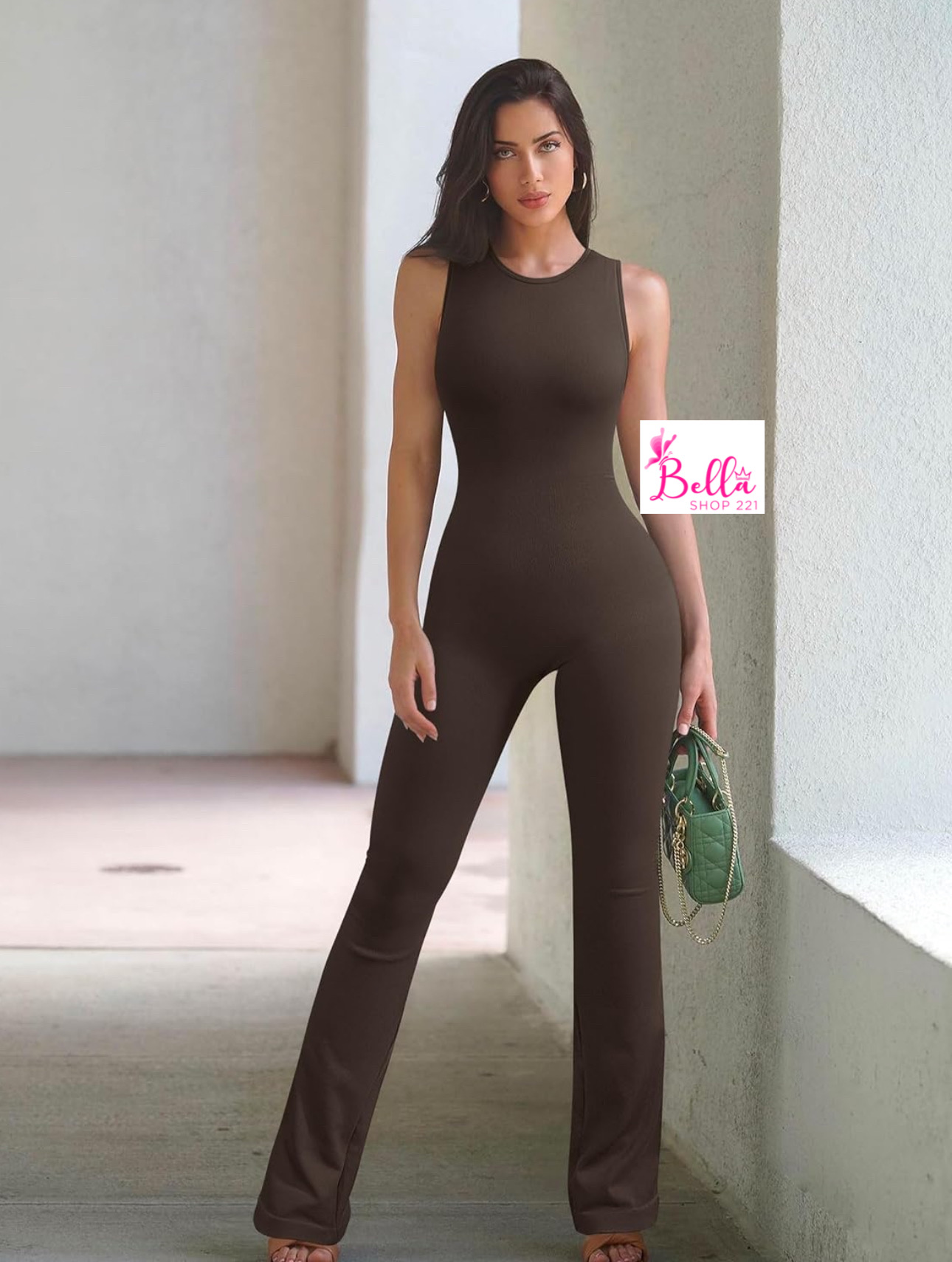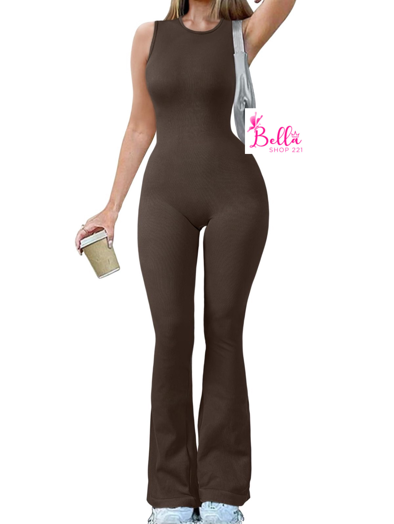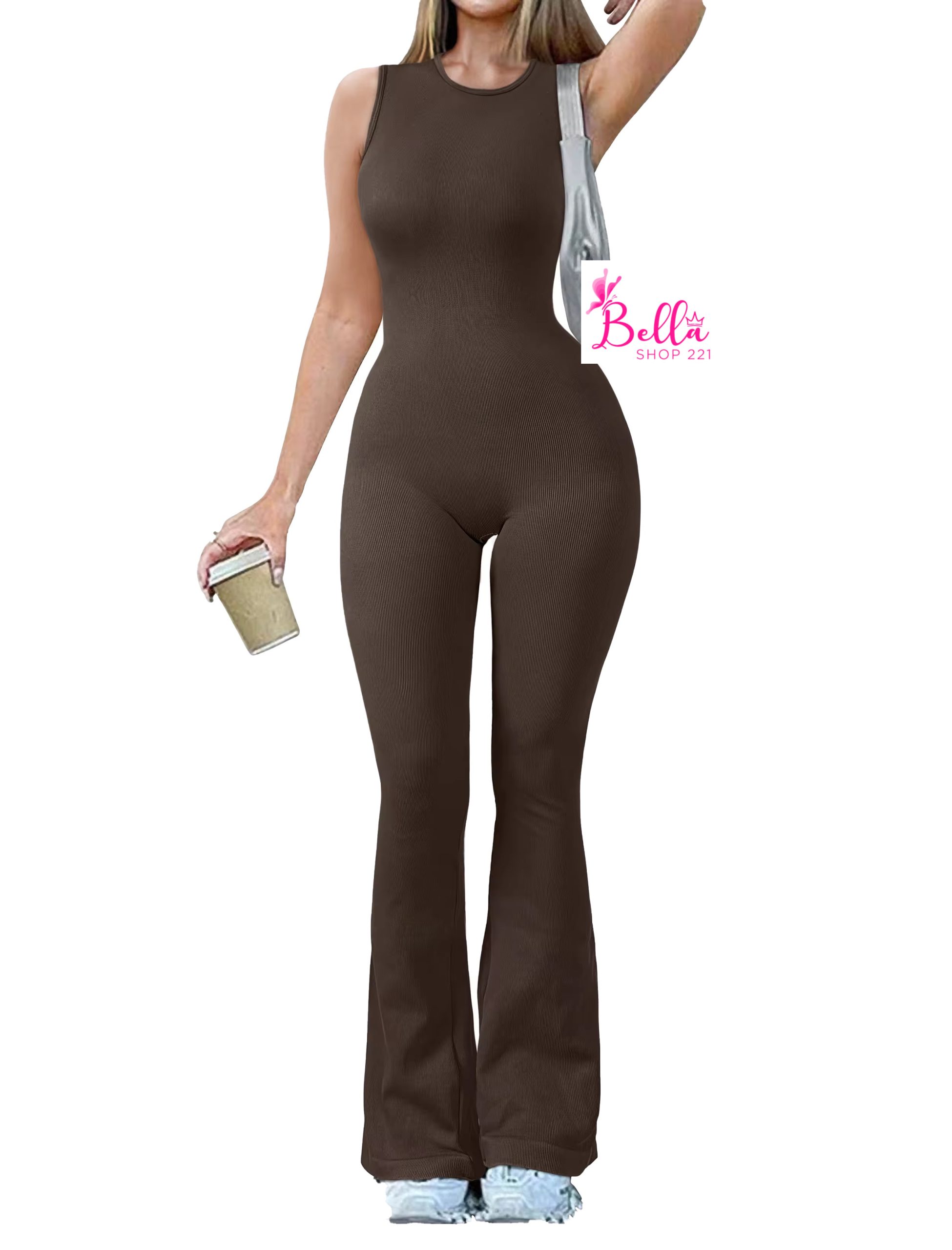 Combinaison débardeur côtelé et gainant avec un bas large – marron