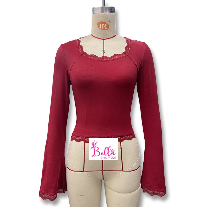 Haut crop top longues manches avec dentelle – rouge