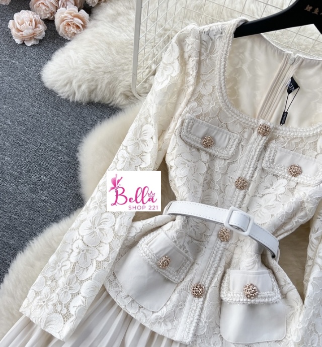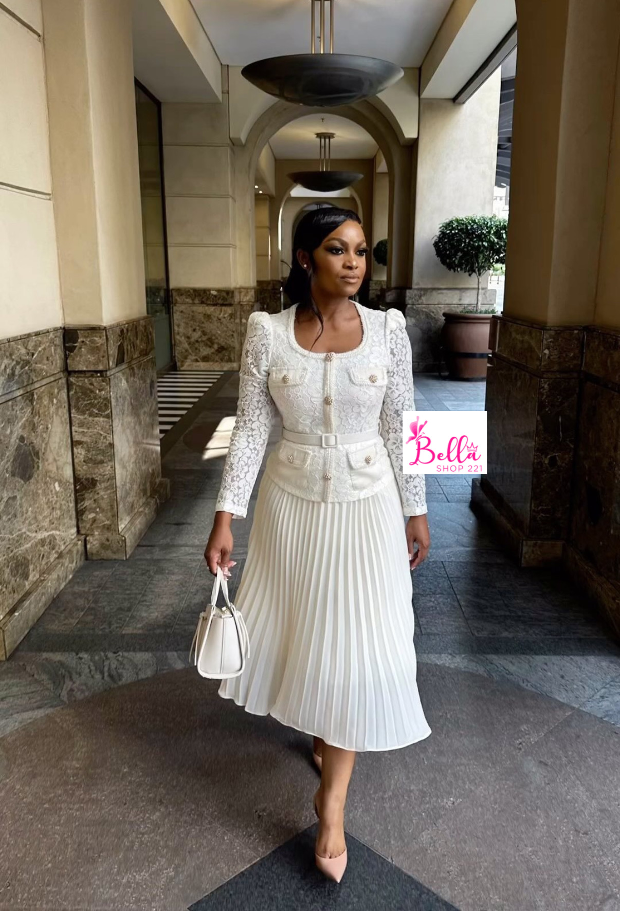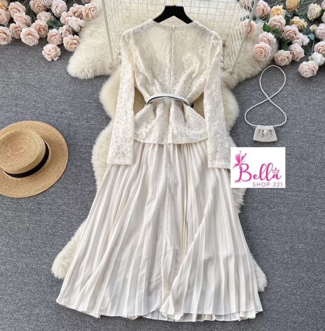 Robe plissée avec dentelle et ceinture – blanc cassé